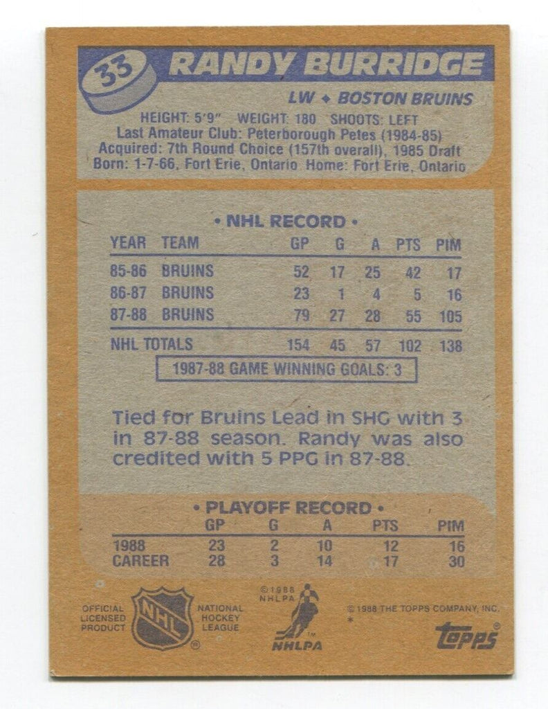 1988 Topps Randy Burridge Signed Card Hockey NHL AUTO #33 Boston Bruins