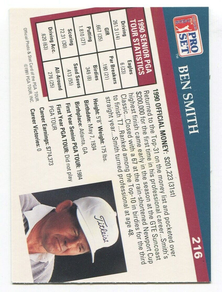 1991 Pro Set PGA Tour Golf Ben Smith Signed Card Autographed #216
