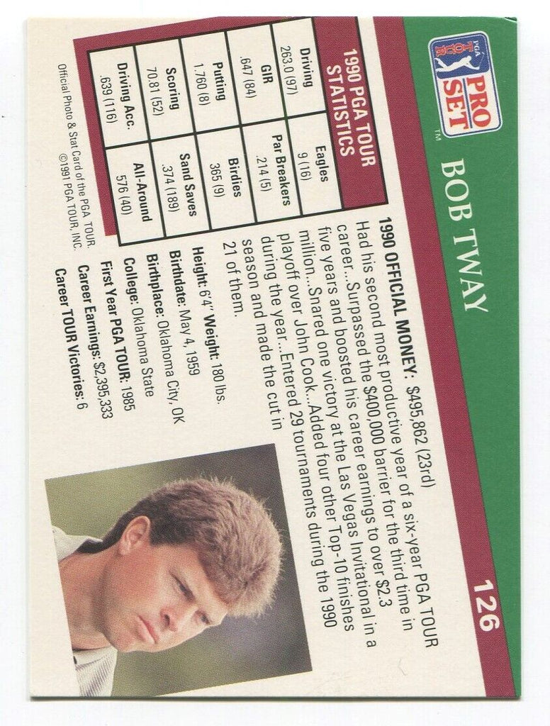 Up for sale is a 1991 Pro Set GPA Tour Golf card of Bob Tway boldly signed on the front. Autographed card was part of a near complete set of signed 1991 Pro Set golf cards that I purchased from the original collector that we are listing for sale individually. We are open to negotiating some appealing best offers if you are interested in purchasing multiple signed cards at the same time. Please also take a look at our over 11,000 other unique autographed items in our store.