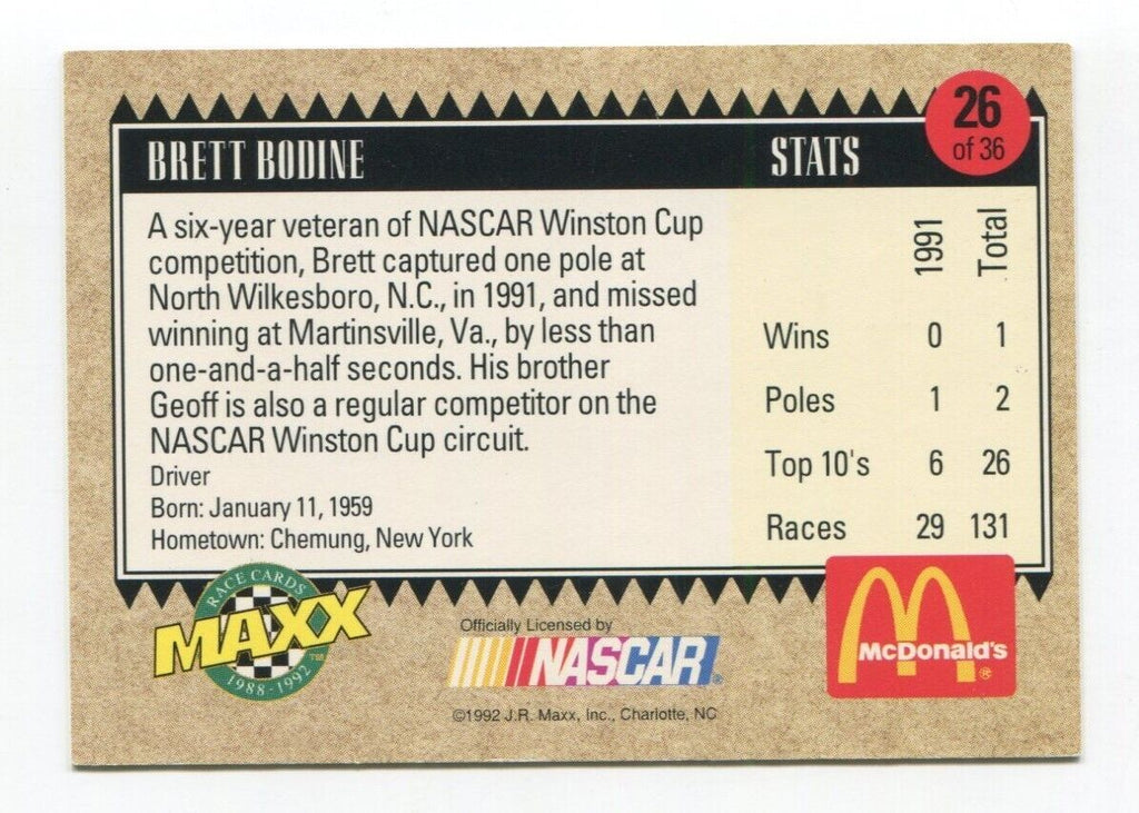 1992 Maxx McDonalds Brett Bodine Signed Card Racing Autograph NASCAR AUTO #26