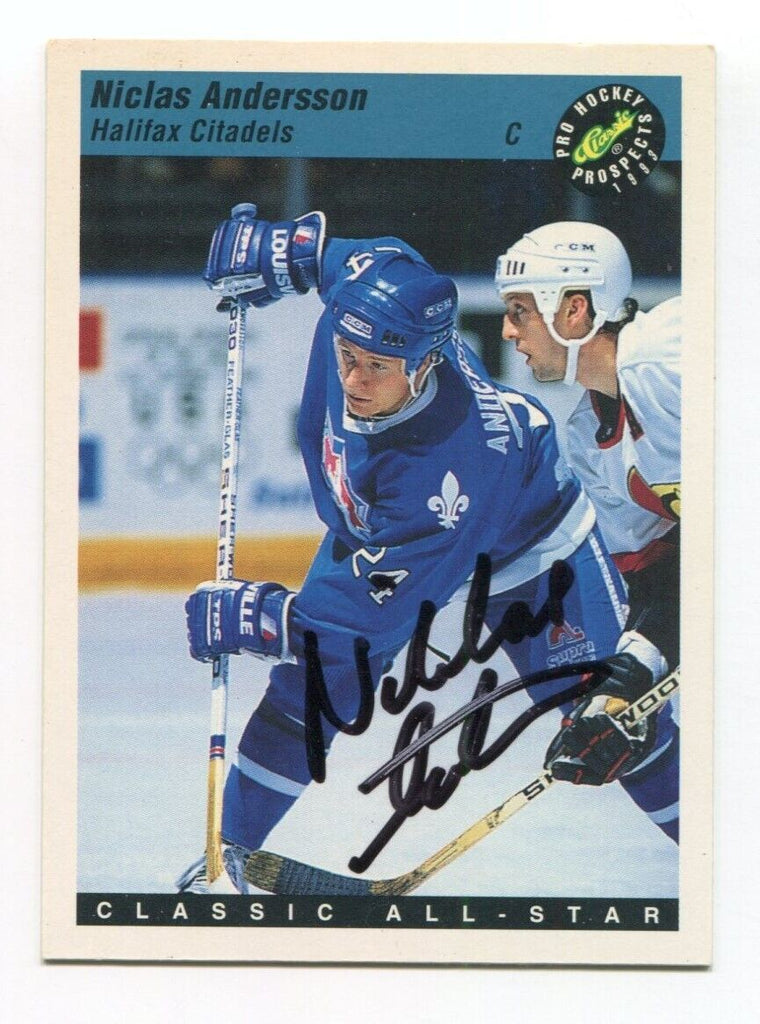 Up for sale is an autographed hockey card, signed by Niclas Andersson. Autograph was one of over 2500 signed sports and non sports cards, all acquired in person or through the mail by the original collector.