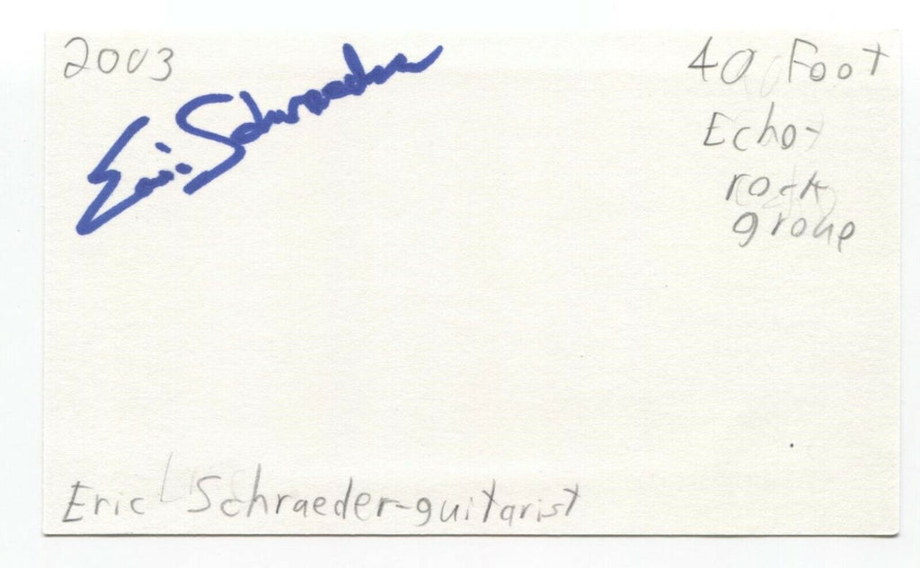 Up for sale is an autographed 3x5 index card, boldly signed by Eric Schraeder, of 40 Foot Echo. Autograph was part of an enormous collection of over 9000 in person collected signatures.