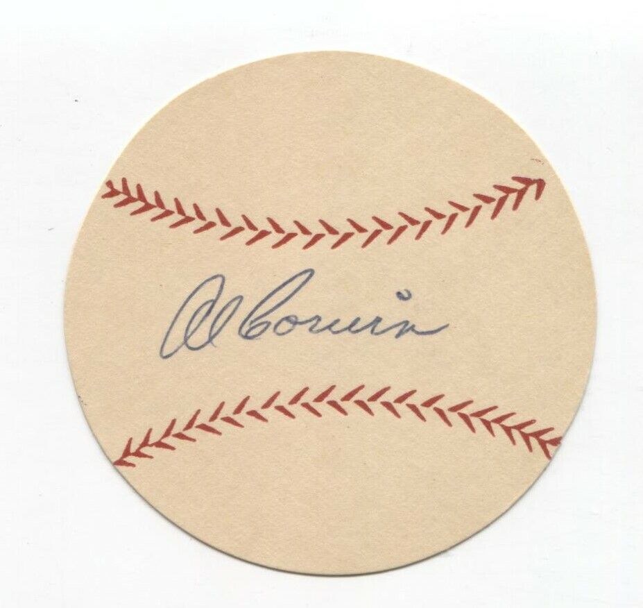 Up for sale is a signed thick paper stock baseball measuring approximately 2.5 inches in diameter, featuring an autograph of Al Corvin.  The third image (not included with the item) shows the original mailing envelope the autograph was received in, postmarked from 1953.  This autograph was part of a large collection of over 700 vintage baseball autographs and memorabilia, all obtained between 1952 and 1954 by the same original owner.