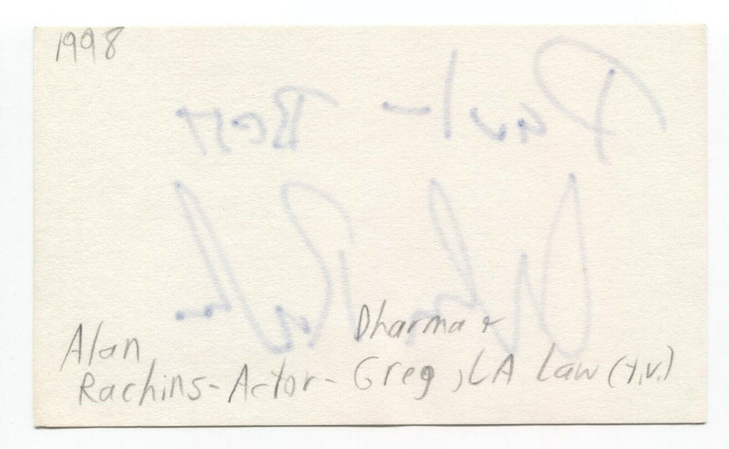 Up for sale is an autographed 3x5 index card, boldly signed by Alan Rachins.  Autograph was part of an enormous collection of over 9000 in person collected signatures.