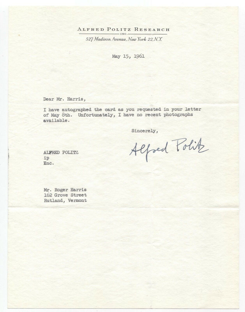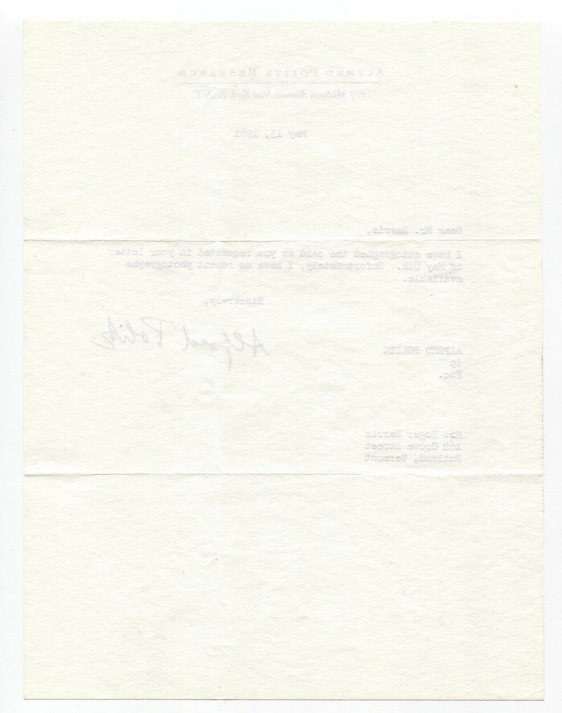 Up for sale is a signed letter, boldly autographed by Alfred Politz. Autograph was part of the well known single owner, original "Roger Harris" collection of thousands of autographs, acquired over many decades of collecting.
