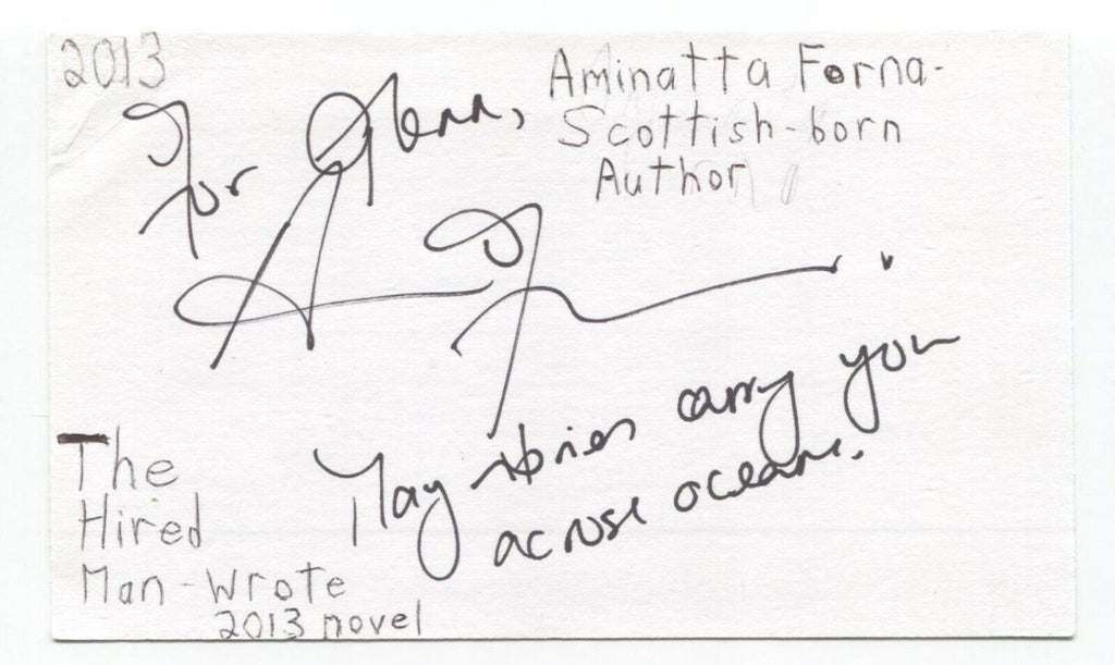Up for sale is an autographed 3x5 index card, boldly signed by author Aminatta Forna. This autograph was part of an enormous collection of over 9000 in person collected signatures.