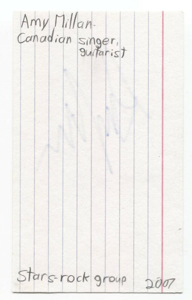 Up for sale is an autographed 3x5 index card, boldly signed by Amy Millan. This autograph was part of an enormous collection of over 9000 in person collected signatures.