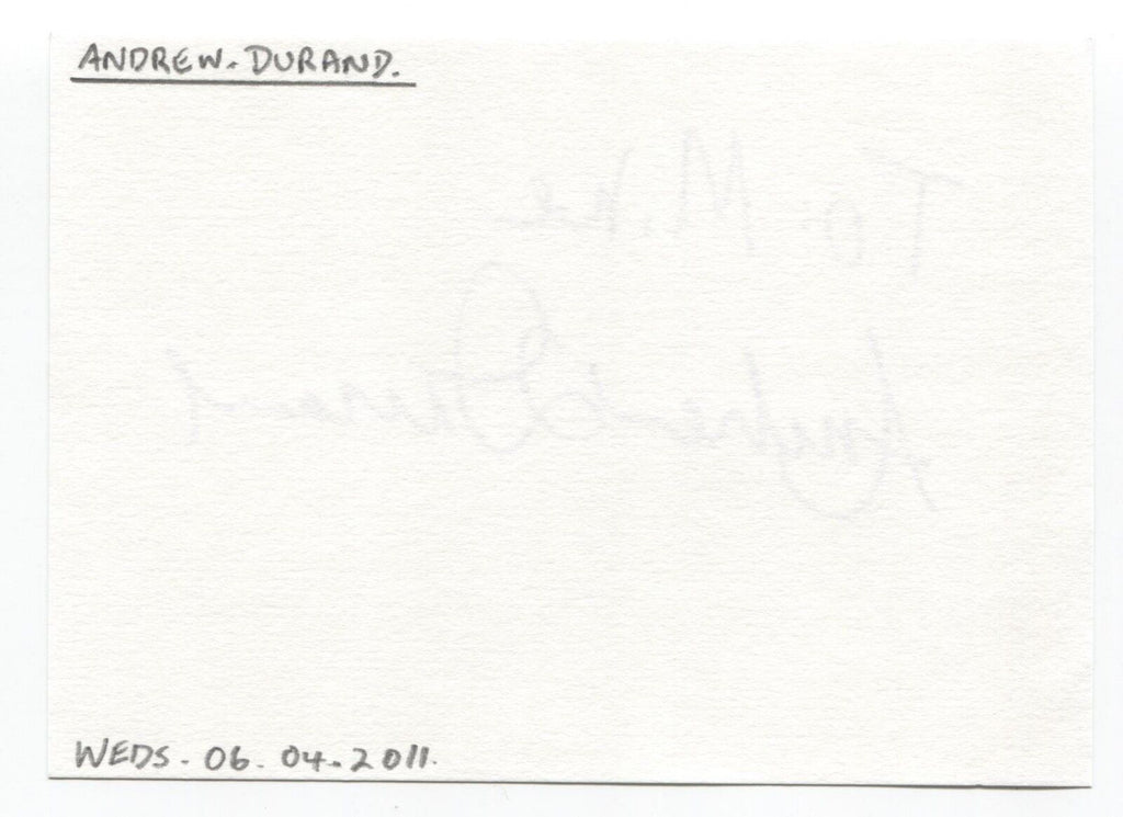 Originating from the "Michael Berry" autograph collection, this thick white paper page features a bold and clear purple pen autograph of Andrew Durand. Page itself measures approximately 5.5 x 4 inches in size.