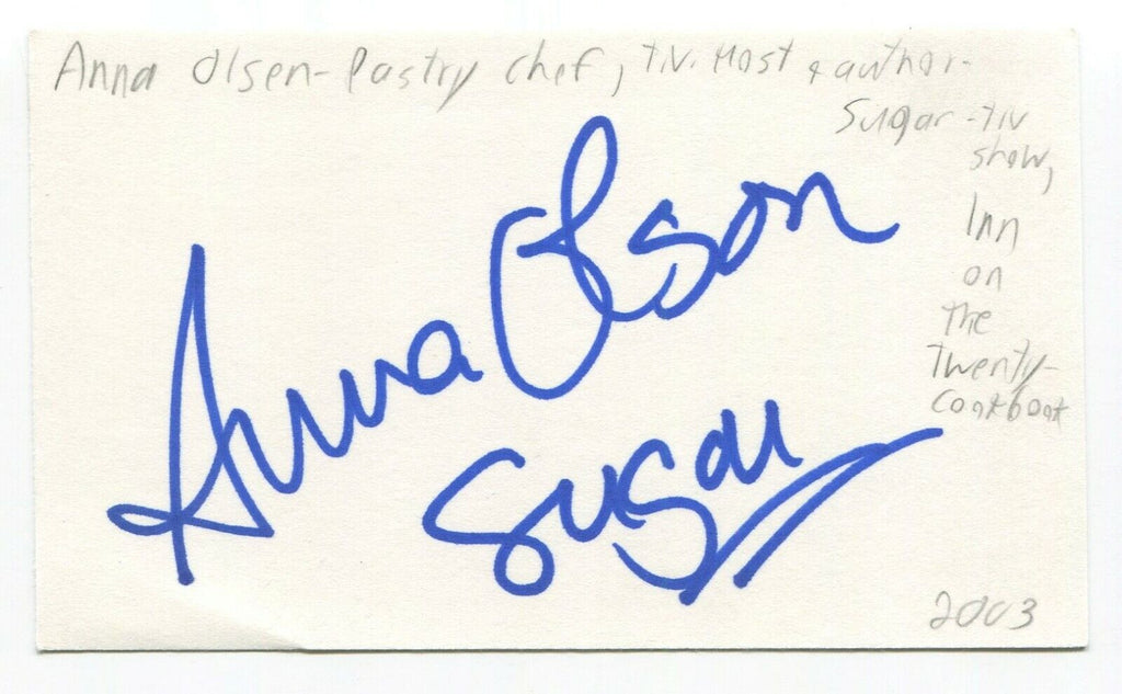 Up for sale is an autographed 3x5 index card, boldly signed by cooking personality and TV host Anna Olsen. Autograph was part of an enormous collection of over 9000 in person collected signatures that I was fortunate to purchase in it's entirety, that belonged to the great Glenn Marshall.