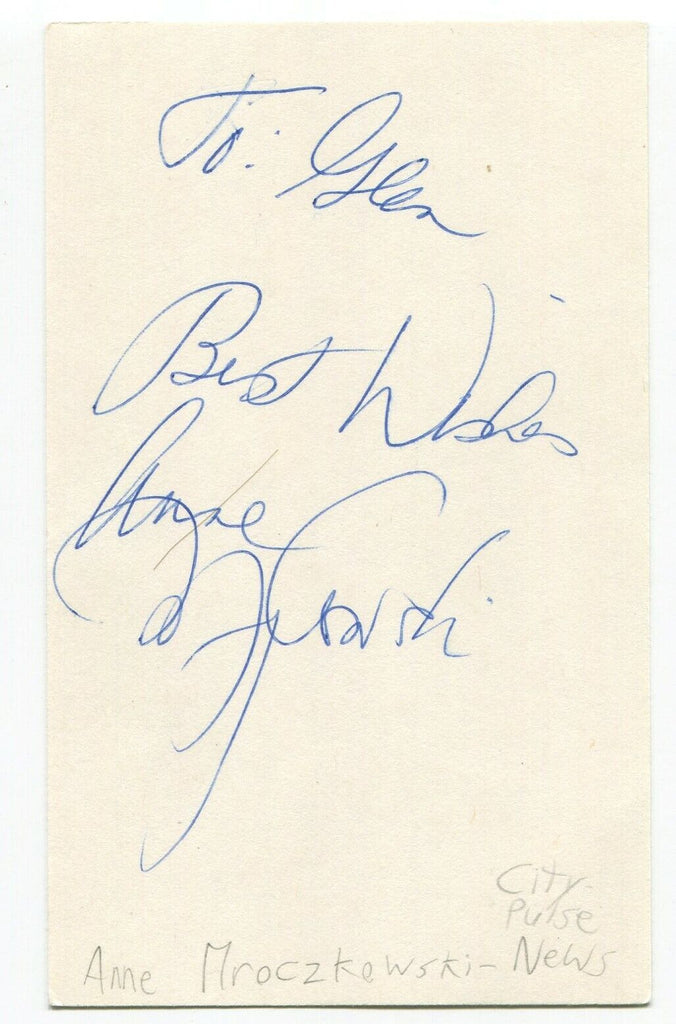 Up for sale is an autographed 3x5 index card, boldly signed by journalist Anne Mrockzkowski. Autograph was part of an enormous collection of over 9000 in person collected signatures.