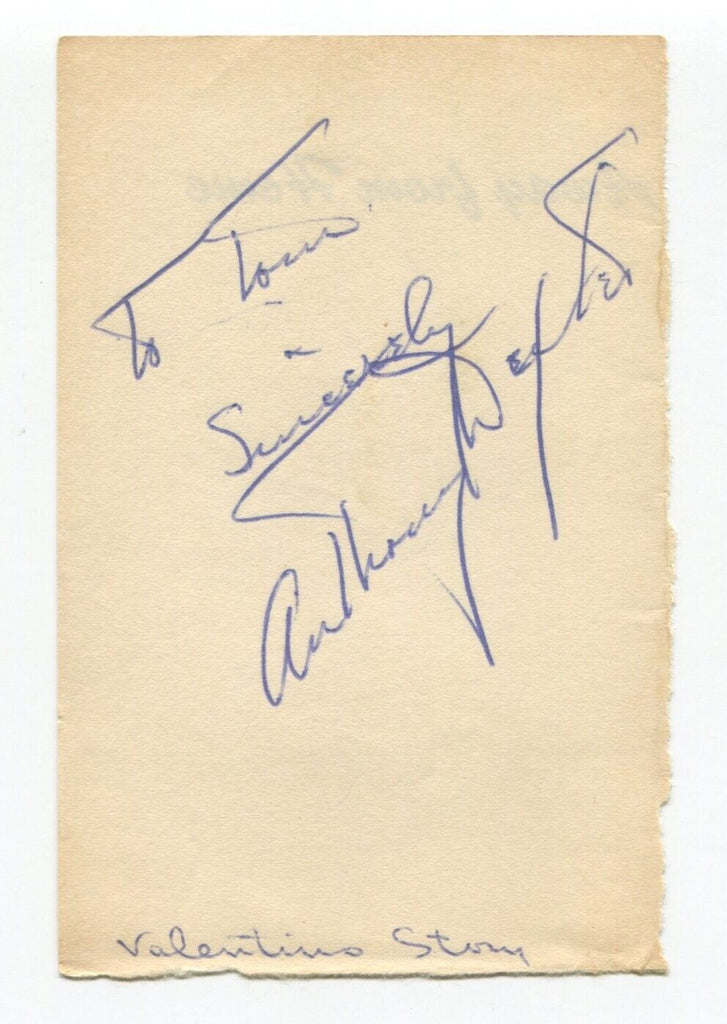 Up for sale is a cut autograph, boldly signed by actor Anthony Dexter. Just an absolutely beautiful signature, on an approximately 4 x 3 inch reverse of a USO tablet page. The autograph originates from the "O'Malley" collection, which encompasses over 200 total signatures. Over the coming weeks, we will be listing the autographs in this collection for sale individually, and there are some truly stellar names and real rarities. We will be listing autographs of Jim Thorpe, John Wayne, Larry Fine, Lou Costello, Bud Abbott, Peter Lorre, Lionel Barrymore, Chico Marx, and many many more. There are many uncommon names from Hollywood in the 1940's and 1950's, with scarce examples of actors from the great films It's a Wonderful Life, Casablanca, and many of the era's Wester films, etc. This collection is 100% authenticity guaranteed by our company Authentic Trading Post, which we stand behind. Please save us as a seller to follow along and keep an eye out for these autographs in the coming weeks. If you have a specific autograph want list with some tough names that you have been hunting for, I can take a look at see if we have them and get those ones listed for sale soon.