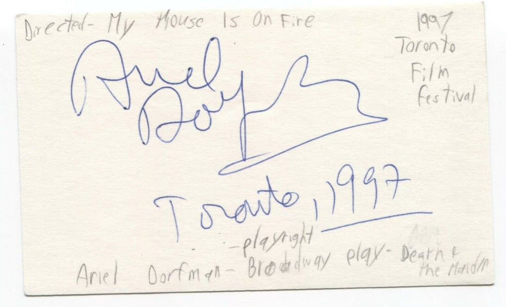 Up for sale is an autographed 3x5 index card, boldly signed by Ariel Dorfman. Autograph was part of an enormous collection of over 9000 in person collected signatures.