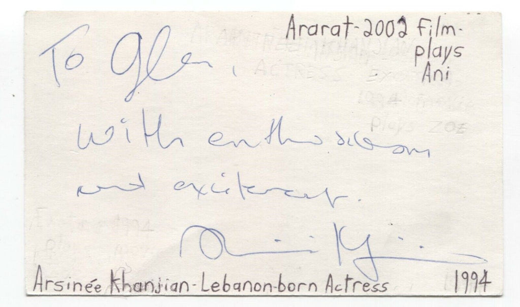 Up for sale is an autographed 3x5 index card, boldly signed by actress Arsinee Khanjian. This autograph was part of an enormous collection of over 9000 in person collected signatures.