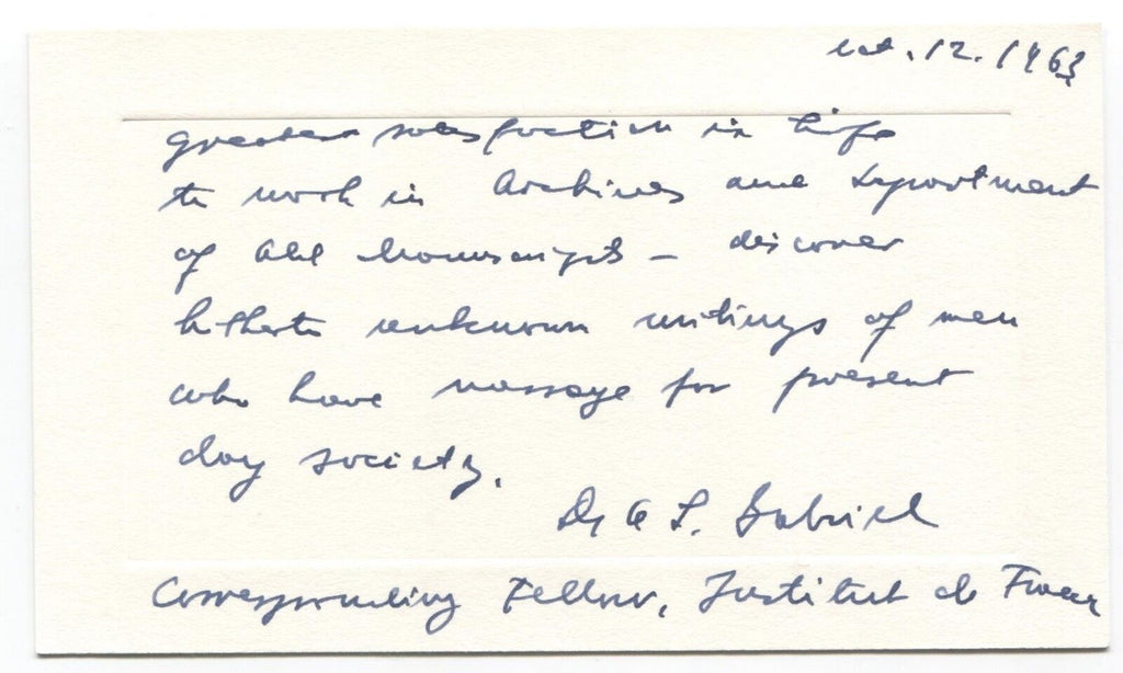 Up for sale is a signed card, boldly autographed by author and medieval historial Astrik L. Gabriel. Autograph was part of the well known single owner, original "Roger Harris" collection of thousands of autographs, acquired over many decades of collecting.