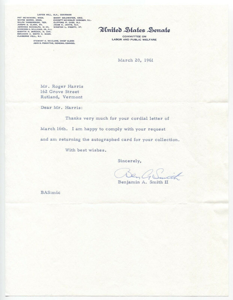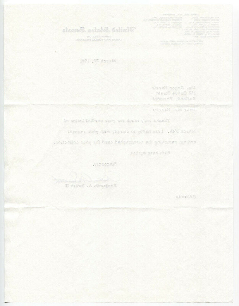Up for sale is a signed letter, boldly autographed by Senator Benjamin A. Smith II.  Autograph was part of the well known single owner, original "Roger Harris" collection of thousands of autographs, acquired over many decades of collecting.