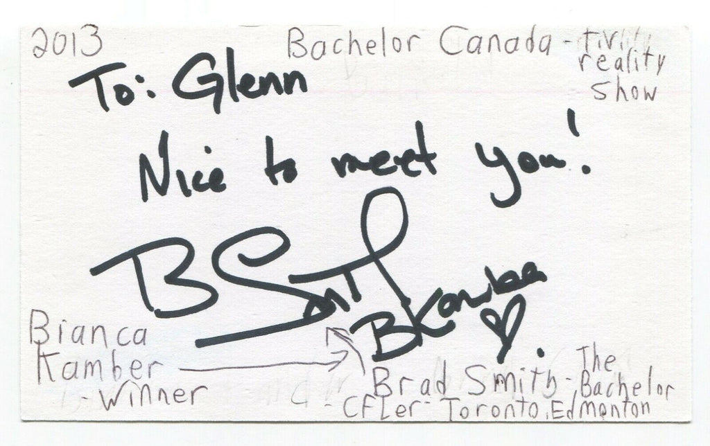 Up for sale is an autographed 3x5 index card, boldly signed by winner of Canada's The Bachelor, Bianca Kamber.  Autograph was part of an enormous collection of over 9000 in person collected signatures that I was fortunate to purchase in it's entirety, that belonged to the great Glenn Marshall.