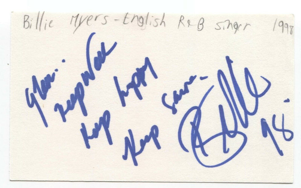 Up for sale is an autographed 3x5 index card, boldly signed by the singer Billie Myers. Autograph was part of an enormous collection of over 9000 in person collected signatures.