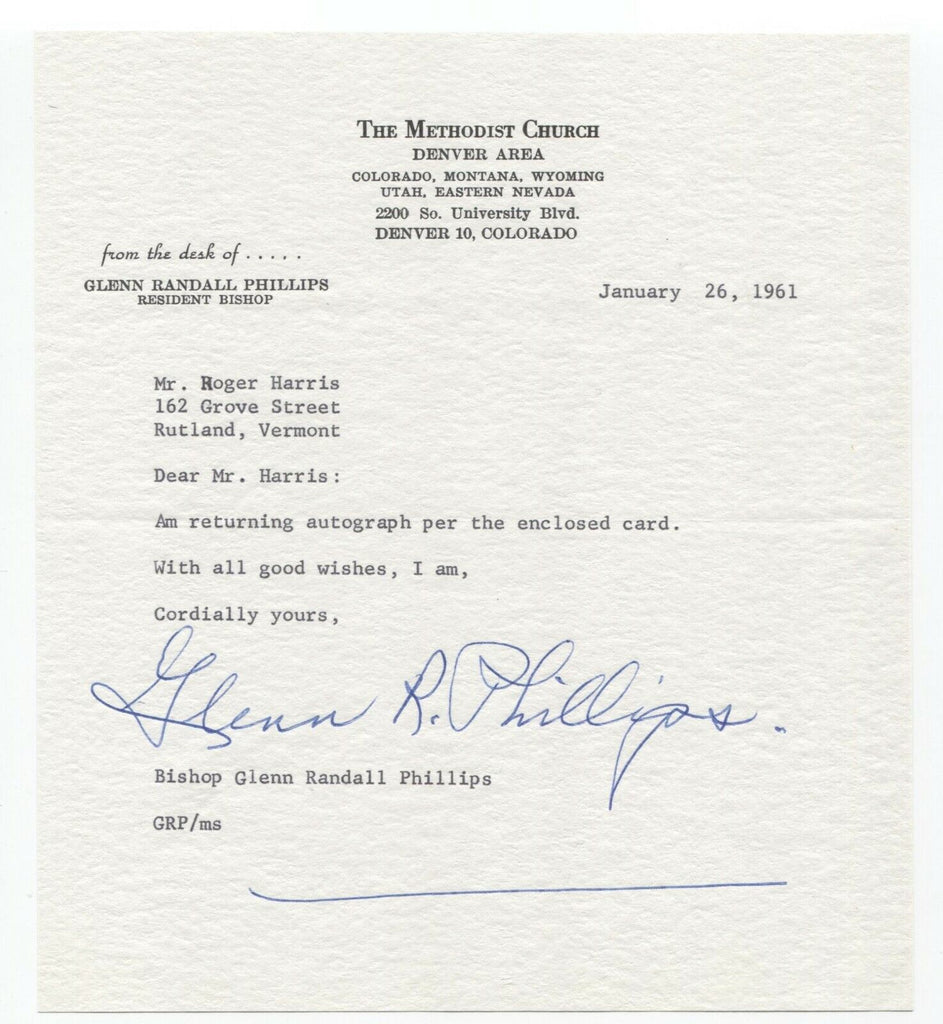 Up for sale is a signed letter, boldly autographed by Bishop Glenn Randall Phillips. Autograph was part of the well known single owner, original "Roger Harris" collection of thousands of autographs, acquired over many decades of collecting.