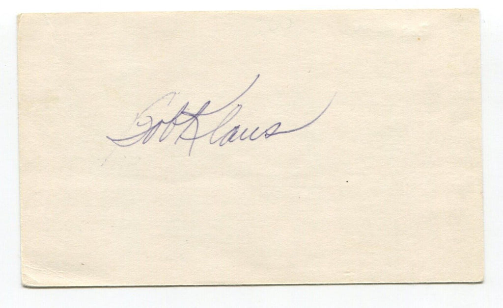 Up for sale is an autographed index card, boldly signed by baseball player Bob Klaus. Just a great looking autograph that will display nicely. Autograph was acquired by renowned autograph collector Roger Harris.