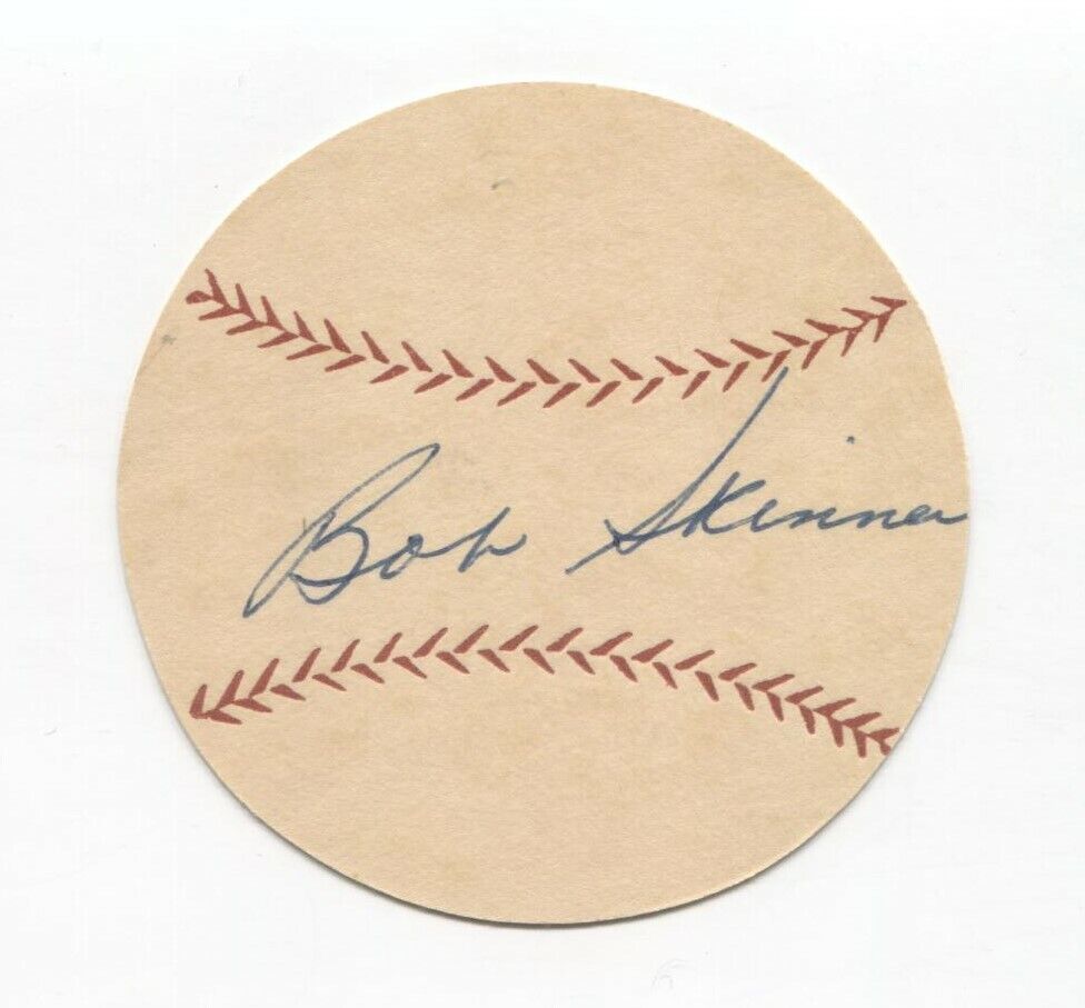 Up for sale is a signed thick paper stock baseball measuring approximately 2.5 inches in diameter, featuring an autograph of Bob Skinner.  The third image (not included with the item) shows the original mailing envelope the autograph was received in, postmarked from 1953.  This autograph was part of a large collection of over 700 vintage baseball autographs and memorabilia, all obtained between 1952 and 1954 by the same original owner.