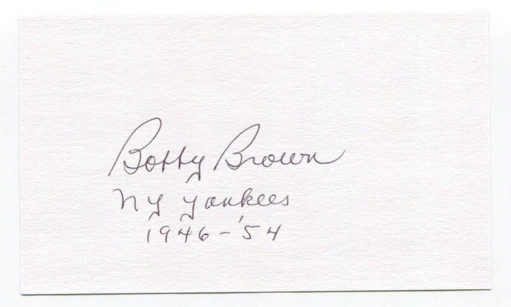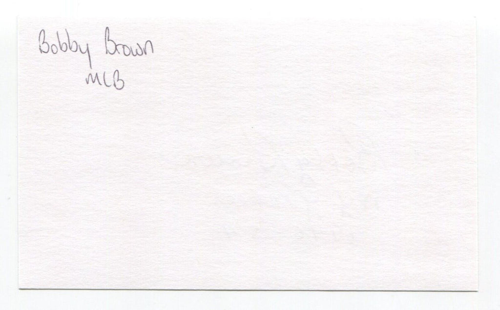 Up for sale is an autographed 3x5 index card, boldly signed by baseball player Bobby Brown. Just a great looking autograph that will display nicely. Autograph was part of a huge "MP" Collection, consisting of over 3,000 signed index cards that I was fortunate to purchase in it's entirety.