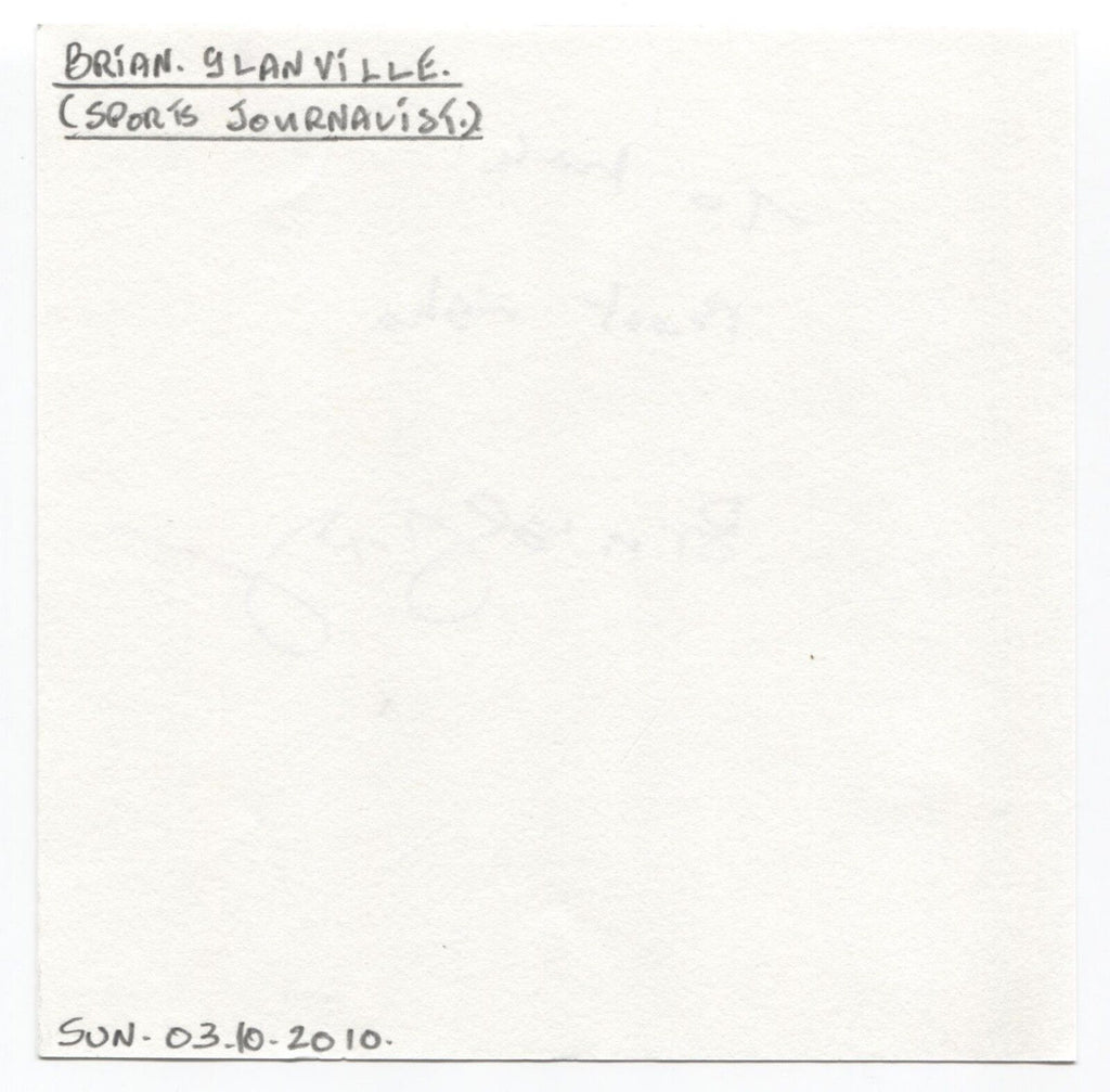 This thick white paper page features a bold and clear purple pen autograph of Brian Glanville. Originating from the "Michael Berry" autograph collection, the page itself measures approximately 5.5 x 5.5 inches in size.
