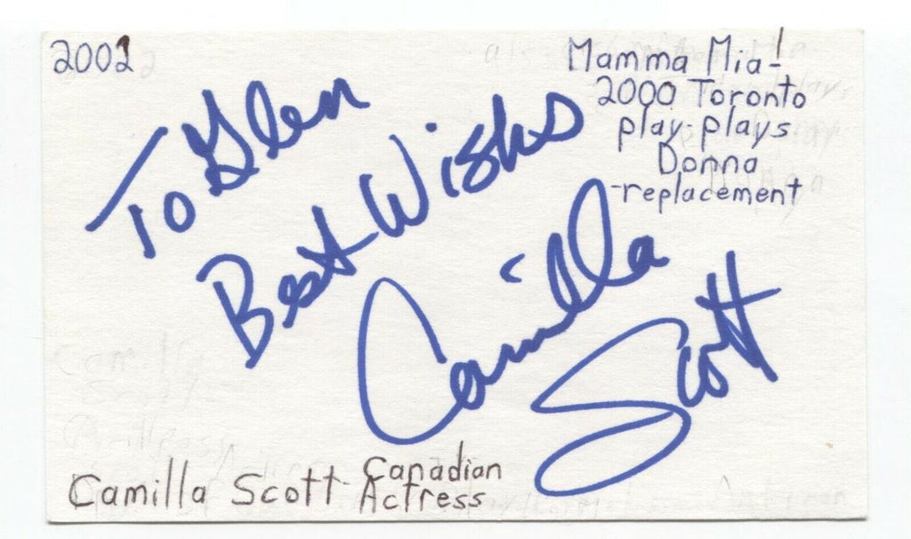 Up for sale is an autographed 3x5 index card, boldly signed by actress Camilla Scott.