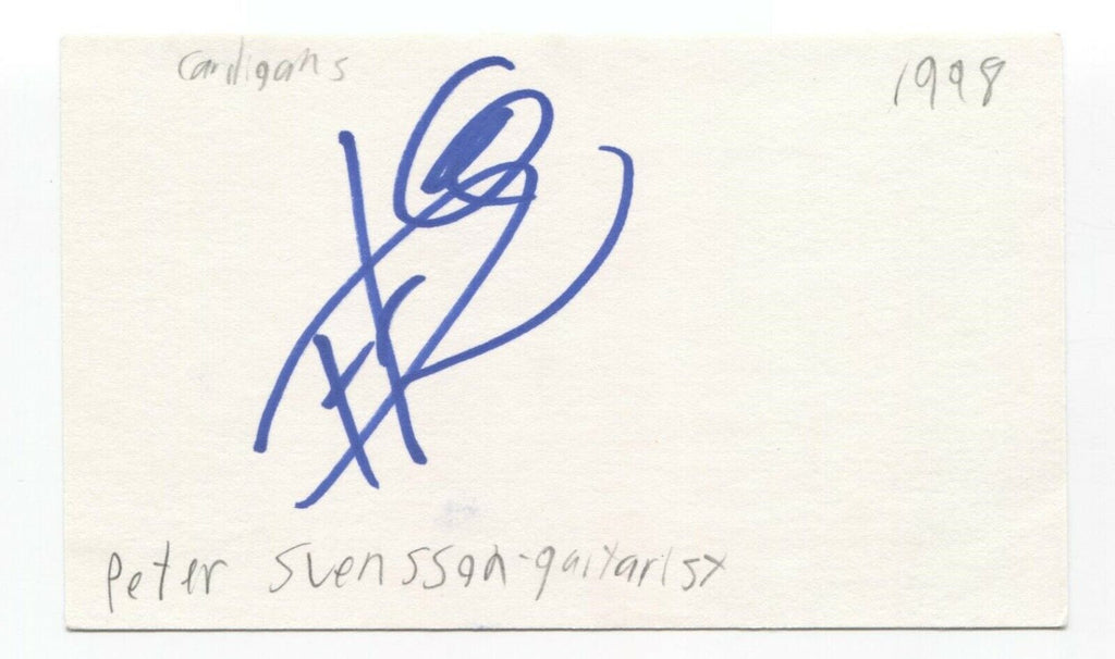 Up for sale is an autographed 3x5 index card, boldly signed by Peter Svensson, of the Cardigans.  This autograph was part of an enormous collection of over 9000 in person collected signatures.