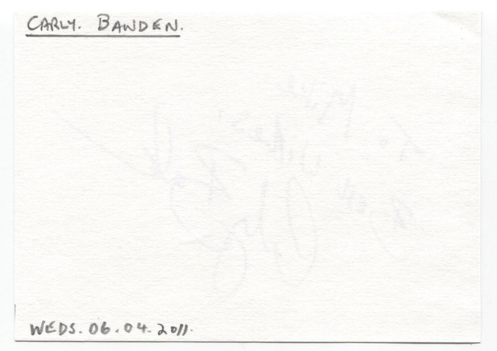 Originating from the "Michael Berry" autograph collection, this thick white paper page features a bold and clear purple pen autograph of Carly Bawden.  Page itself measures approximately 5.5 x 4 inches in size.