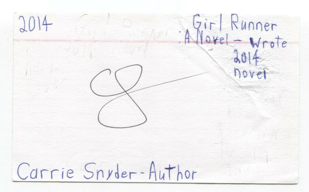 Up for sale is an autographed index card, boldly signed by author Carrie Snyder. This autograph was part of an enormous collection of over 9000 in person collected signatures.