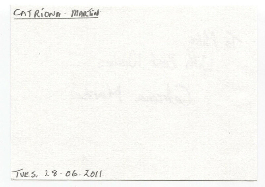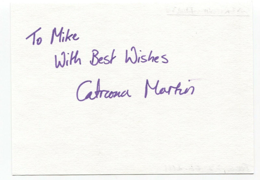 This thick white paper page features a bold and clear purple pen autograph of Catriona Martin. Originating from the "Michael Berry" autograph collection, the page itself measures approximately 5.5 x 4 inches in size.
