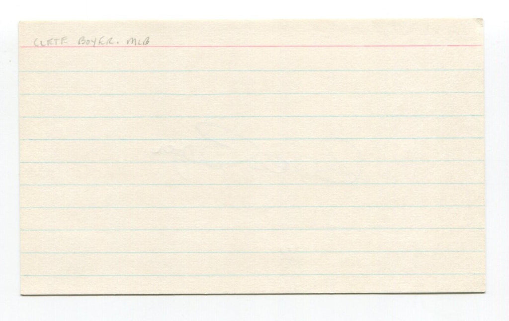 Up for sale is an autographed 3x5 index card, signed by basketball player Clete Boyer. Just a great looking autograph that will display nicely. Autograph was part of the Lynnwood Collection of over 100 signed index cards.