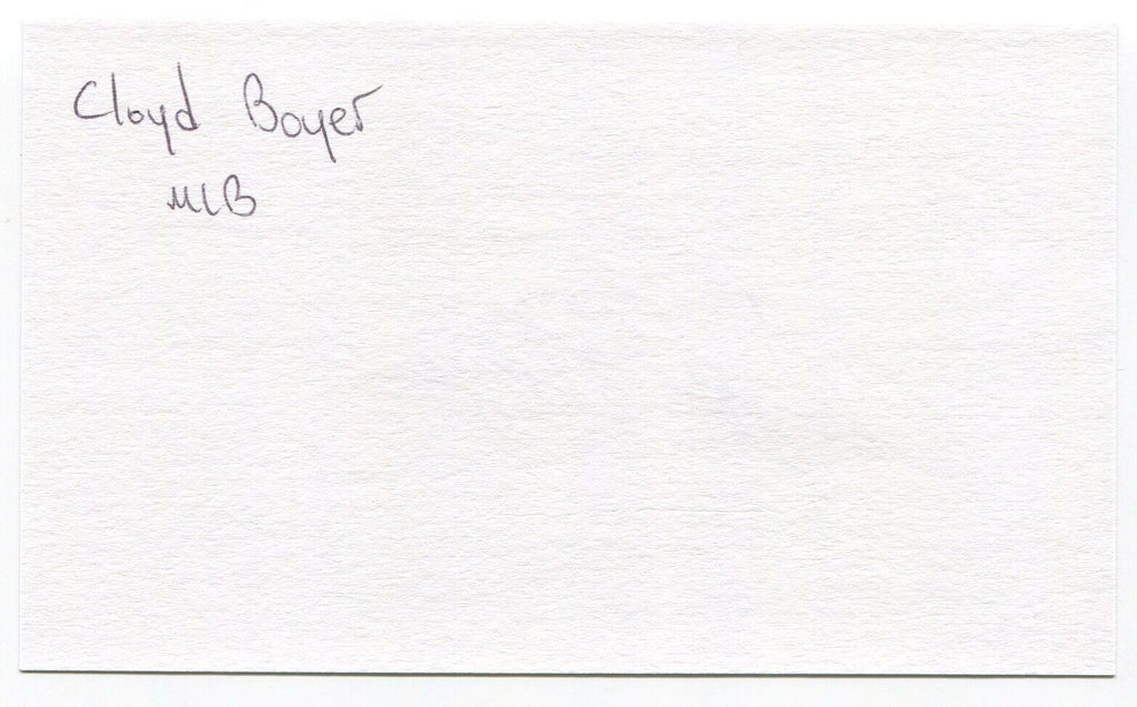 Up for sale is an autographed 3x5 index card, boldly signed by baseball player Cloyd Boyer. Just a great looking autograph that will display nicely.   Autograph was part of a huge "MP" Collection, consisting of over 3,000 signed index cards that I was fortunate to purchase in it's entirety.