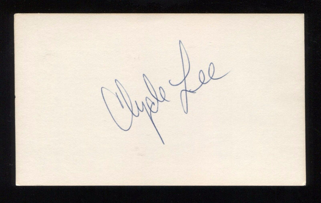 Up for sale is a 3x5 index card signed by Clyde Lee.   Boldly signed in blue ink pen on the index card, this will be a great example to matte and frame with a vintage photo.  Autograph was obtained circa the 1970's by an autograph collector whose collection I purchased in it's entirety.