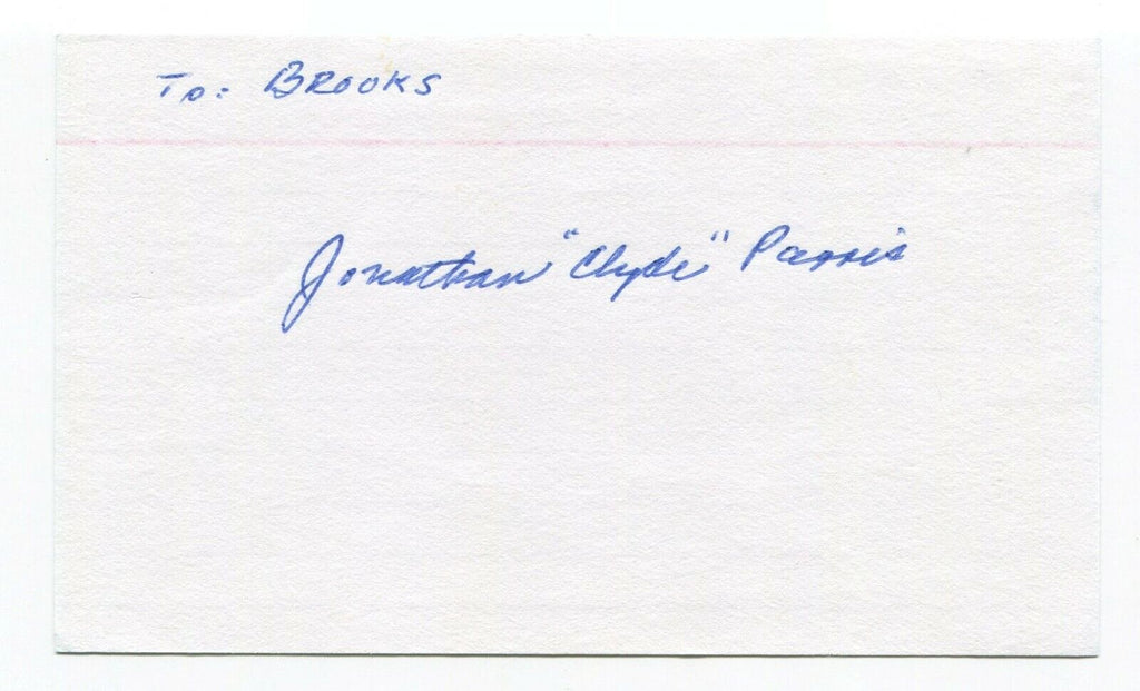 Up for sale is an autographed 3x5 index card, boldly signed by Negro League player Jonathan "Clyde" Parris.   Autograph was part of the large "Brooks Wyatt" collection of over 700 signatures that I was fortunate to purchase in it's entirety.