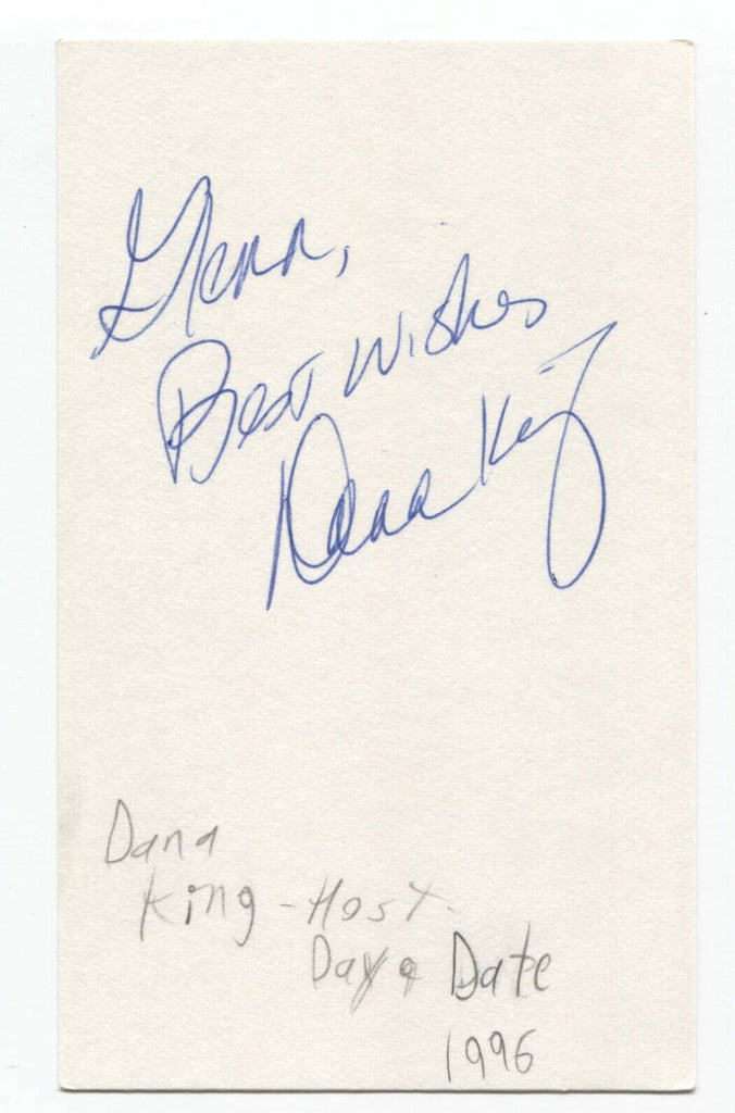 Up for sale is an autographed 3x5 index card, boldly signed by Broadcaster Dana King.  Autograph was part of an enormous collection of over 9000 in person collected signatures that I was fortunate to purchase in it's entirety.