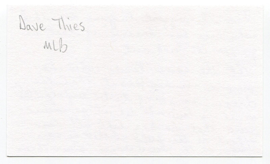 Up for sale is an autographed cut 3x5 index card, boldly signed by baseball player Dave Thies. Just a great looking autograph that will display nicely.   Autograph was part of a huge "MP" Collection, consisting of over 3,000 signed index cards that I was fortunate to purchase in it's entirety.