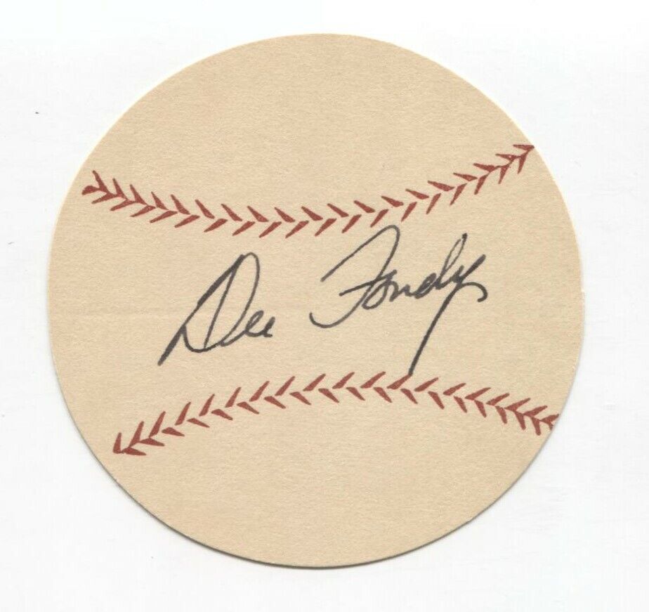 Up for sale is a signed thick paper stock baseball measuring approximately 2.5 inches in diameter, featuring an autograph of Dee Fondy. The third image (not included with the item) shows the original mailing envelope the autograph was received in, postmarked from 1953. This autograph was part of a large collection of over 700 vintage baseball autographs and memorabilia, all obtained between 1952 and 1954 by the same original owner.