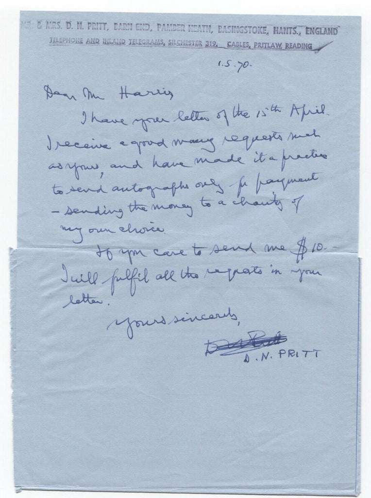 Up for sale is a signed letter, boldly autographed by Denis Pritt. Note that the handwritten letter features his signatue, which he then crossed out and signed below with his printed name. The letter was asking for a donation in order to receive his autograph. Autograph was part of the well known single owner, original "Roger Harris" collection of thousands of autographs, acquired over many decades of collecting.