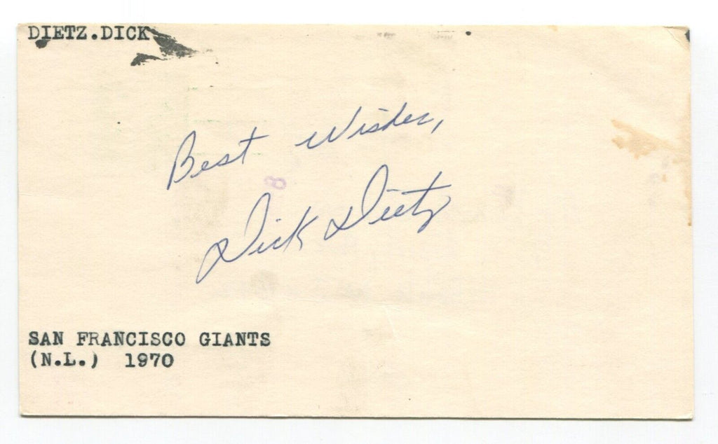 Up for sale is an autographed post card, signed by baseball player Dick Dietz. Just a great looking autograph that will display nicely. Autograph was part of the JP collection consisting of over 350 autographed index cards.