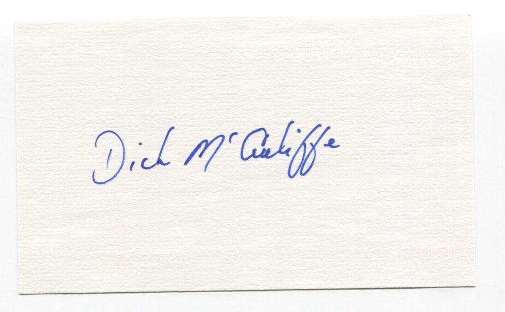 Up for sale is an autographed cut adhered to a 3x5 index card, signed by baseball player Dick McAuliffe. Just a great looking autograph that will display nicely. Autograph was part of the JP collection consisting of over 350 autographed index cards.