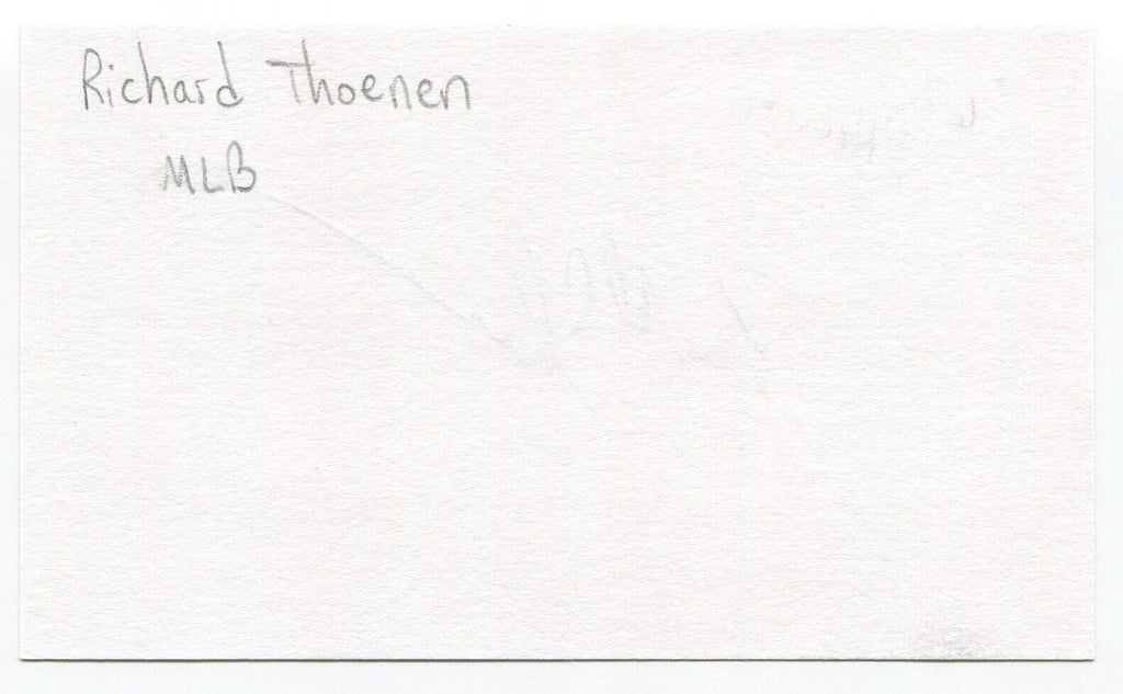 Up for sale is an autographed cut 3x5 index card, boldly signed by baseball player Richard "Dick" Thoenen. Just a great looking autograph that will display nicely. Autograph was part of a huge "MP" Collection, consisting of over 3,000 signed index cards that I was fortunate to purchase in it's entirety.