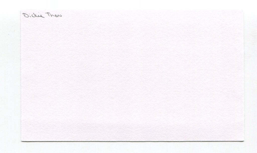Up for sale is an autographed cut adhered to a 3x5 index card, signed by baseball player Dickie Thon. Just a great looking autograph that will display nicely. Autograph was part of the JP collection consisting of over 350 autographed index cards.