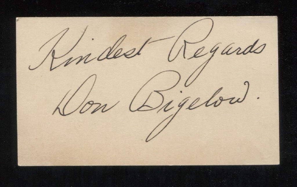 Up for sale is this signed card, autographed boldly by the very tough autograph to find, Don Bigelow. Nice early career signature of the great orchestra leader. Card measures approximately 3.25 x 2 inches in size, and is the perfect example to matte and frame with a vintage photograph. Autograph was part of a vintage collection spanning 1931 - 1953, of which I purchased in it's entirety, and will be listing over the coming week.