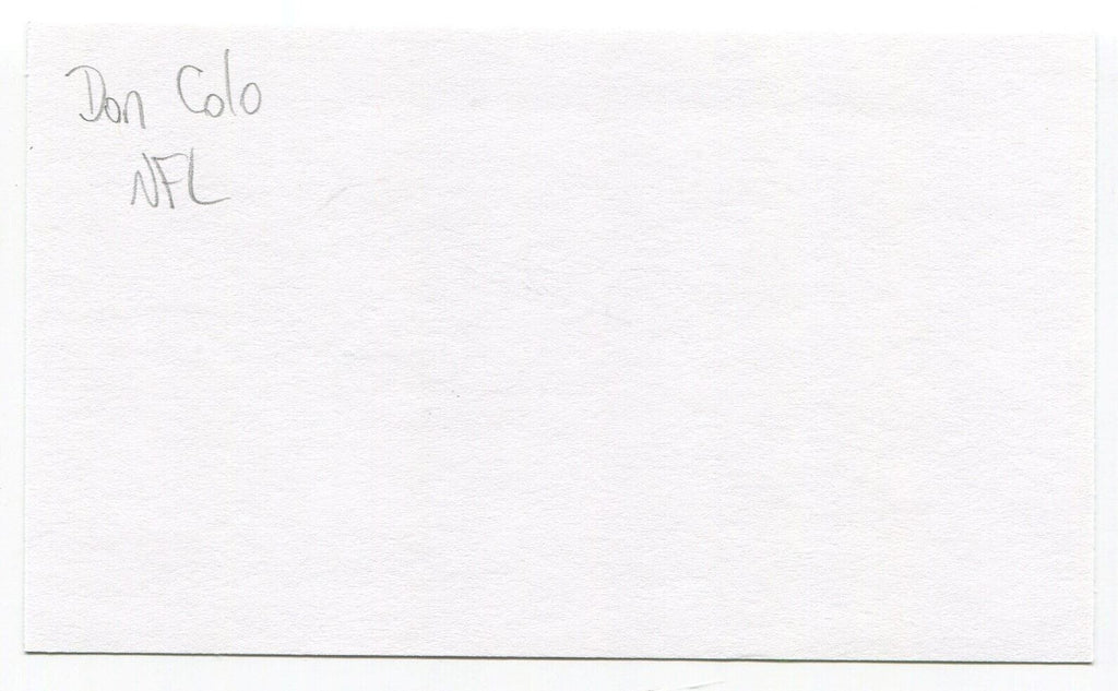 Up for sale is an autographed 3x5 index card, boldly signed by football player Donald "Don" Colo. Just a great looking autograph that will display nicely.   Autograph was part of a huge "MP" Collection, consisting of over 3,000 signed index cards that I was fortunate to purchase in it's entirety.