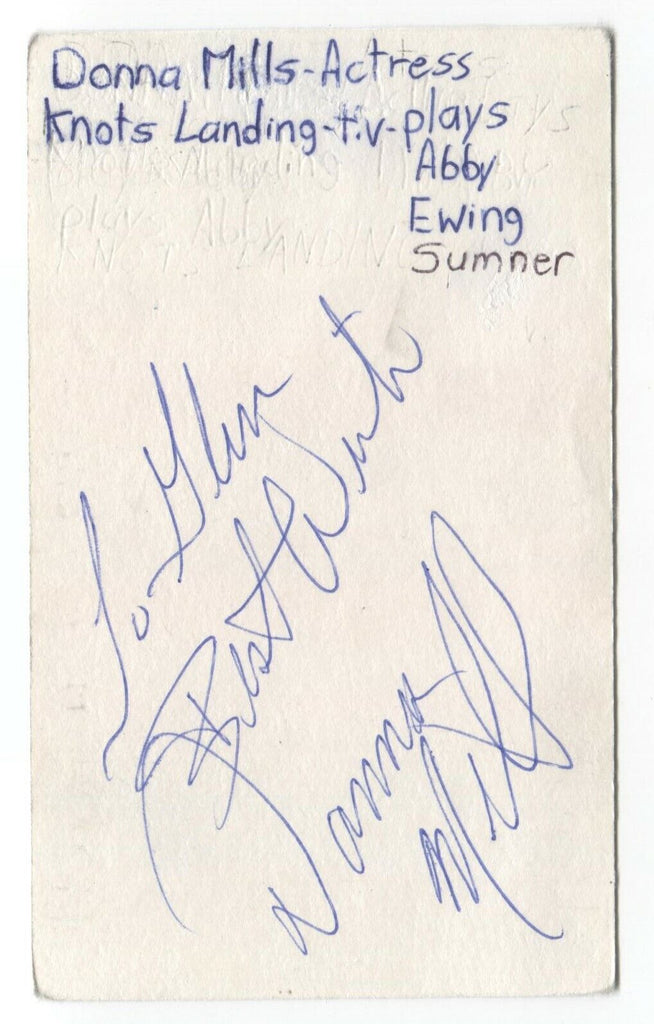 Up for sale is an autographed 3x5 index card, boldly signed by Donna Mills.  Autograph was part of an enormous collection of over 9000 in person collected signatures.