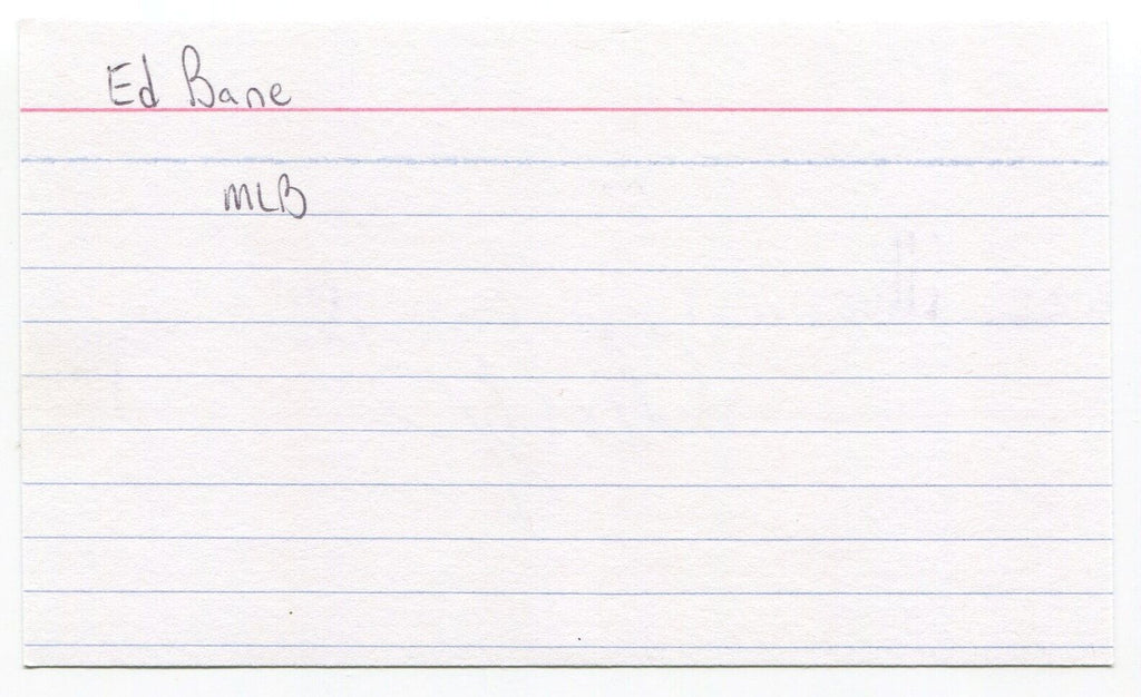 Up for sale is an autographed 3x5 index card, boldly signed by "Ed" Eddie Bane. Just a great looking autograph that will display nicely.   Autograph was part of a huge "MP" Collection, consisting of over 3,000 signed index cards that I was fortunate to purchase in it's entirety.