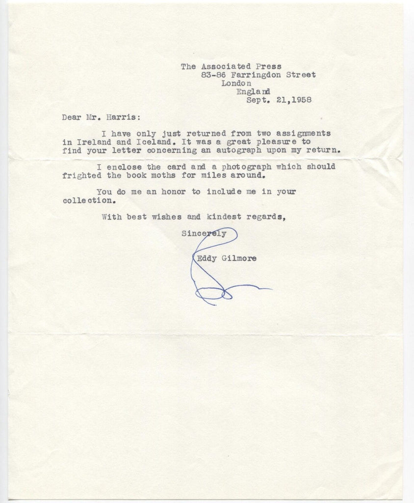 Up for sale is a signed letter, boldly autographed by Pulitzer Prize winning reporter, Eddy Gilmore. Autograph was part of the well known single owner, original "Roger Harris" collection of thousands of autographs, acquired over many decades of collecting.