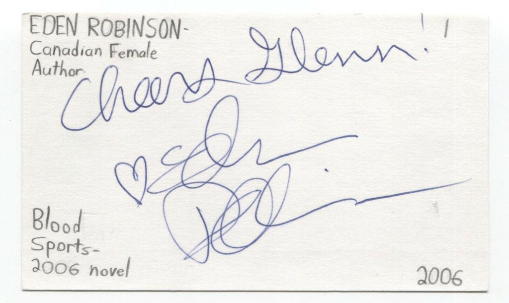 Eden Robinson Signed 3x5 Index Card Autographed Signature Author Writer
