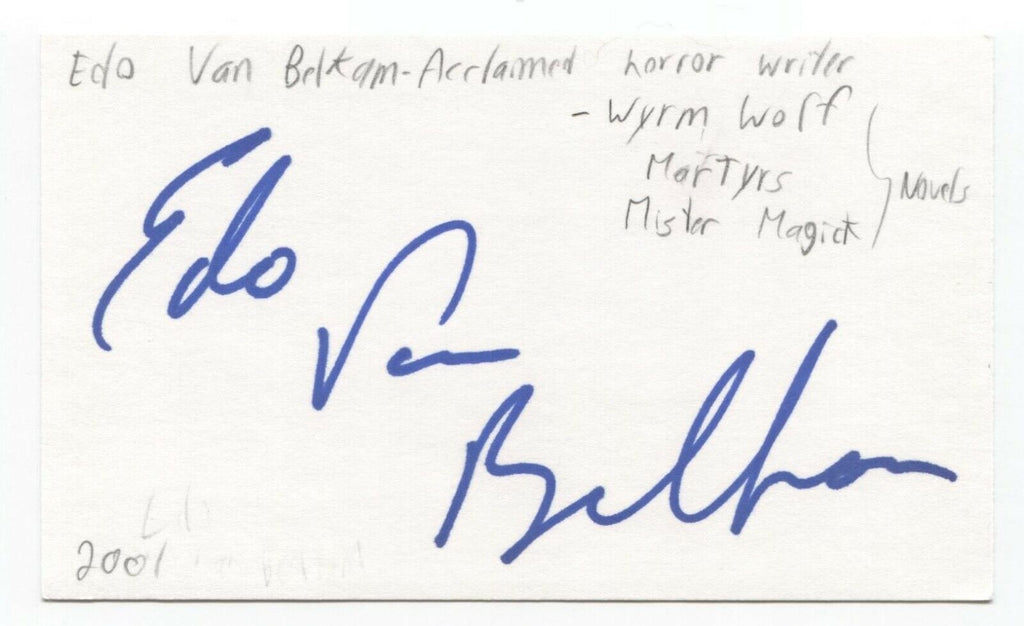 Up for sale is an autographed 3x5 index card, boldly signed by writer Edo van Belkom. This autograph was part of an enormous collection of over 9000 in person collected signatures.